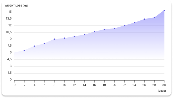 - gradvis och säker viktminskning med en lägsta hastighet på 15 kg per 30 dagar